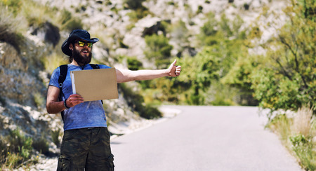 Hitch-hiking traveler with a blank cardboard sign on a mountain road. Budget travel. Auto stop