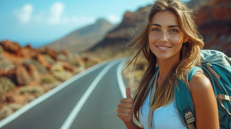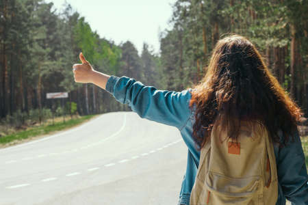 young woman with backpack hitchhiking on the road