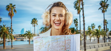in Barcelona for a perfect winter. smiling modern woman in earmuffs on embankment in Barcelona, Spain with map