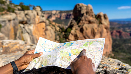 A hiker pauses at a breathtaking canyon viewpoint, tracing a path on a paper map. This moment captures the spirit of adventure, planning the next leg of a journey through the vast, sun-drenched wilderness. Its a scene of discovery and self-reliance in nature.