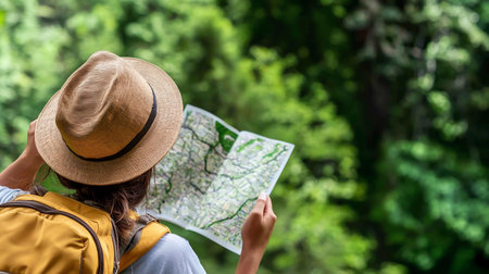 Back view of a hiker with straw hat and yellow backpack reading a map in a lush green forest, exploring nature and planning the route.
