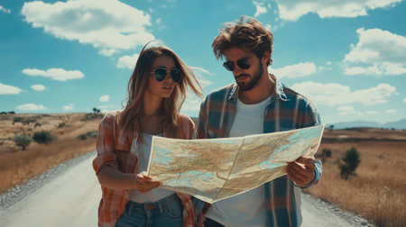 A couple examines a detailed map on a sunny day while exploring a remote countryside road surrounded by golden fields and blue skies