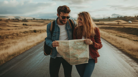 Couple exploring scenic road with vintage map during autumn afternoon in a rural landscape