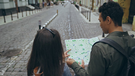Multiethnic couple looking at map on urban street