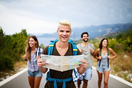 Friendship, travel, vacation, summer and people concept. Group of smiling friends with map traveling