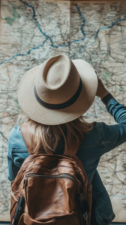 A traveler with a stylish hat analyzes a detailed map while considering various travel agency options for a future trip. The focus is on choosing exciting destinations.