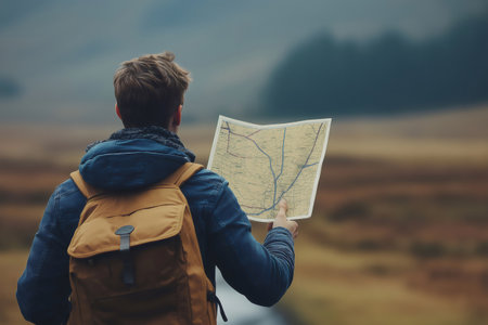 Young man wearing a backpack, studying a map while embarking on an adventurous hike through a stunning valley surrounded by nature