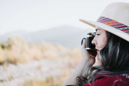 Close up of young latin woman wearing a red poncho and a hat, taking photos with a vintage camera.