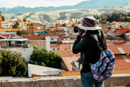 A tourist photograph of the city of Sucre. Bolivia. Blurred city background
