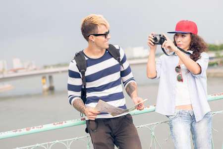 Young couple of hipster tourist with a retro camera are talking to each other while walking around the city. Romantic love story
