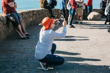Portugal, Sintra, June 26, 2018: A tourist takes pictures of sights or records videos on Cape Roca. Nearby are other tourists.