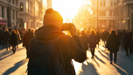 Capturing city life during golden hour, a photographer walks through a bustling street, snapping candid moments with a camera