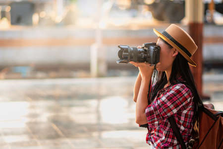Young and beautiful asian tourist taking photos of monument with reflex camera during her vacation trip.