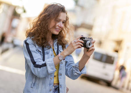 Cheerful curly hair woman tourist with retro camera walking along city street on bright sunny day. travel concept