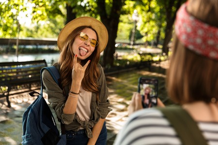 Photo of young emotional cute ladies friends walking outdoors with backpacks take a photo by mobile phone.