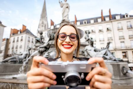 Attractive tourist woman photographer taking images with dslr camera outdoor in city street