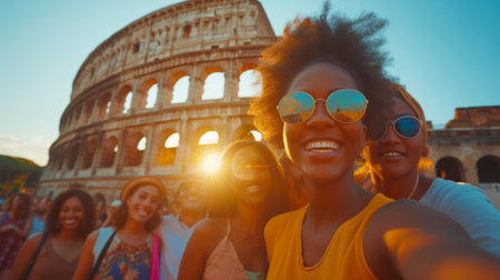 A group of friends taking a selfie in front of the Colosseum at sunset, joyful and smiling.