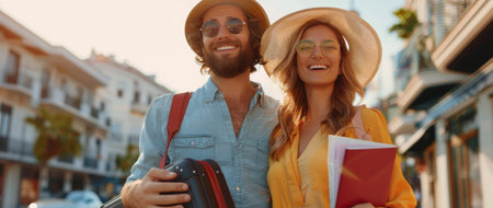 A smiling couple walks down a city street, holding a guidebook and a suitcase.