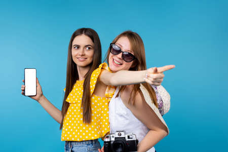 Two young women in summer vacation, blue background. Brunette holding space mock up smartphone, point index finger in distance, blonde smiling, looking to the camera in sunglasses. High quality photo