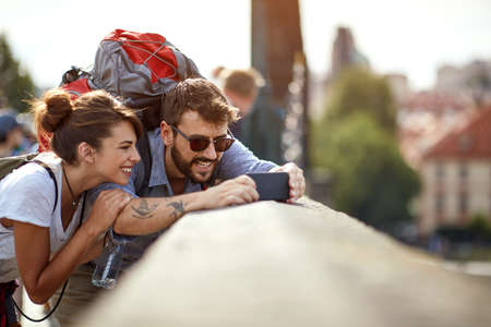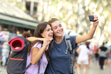 Backpacker friends taking selfie with a smart phone in the street