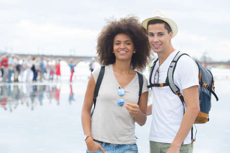 Smiling couple of tourists with the camera