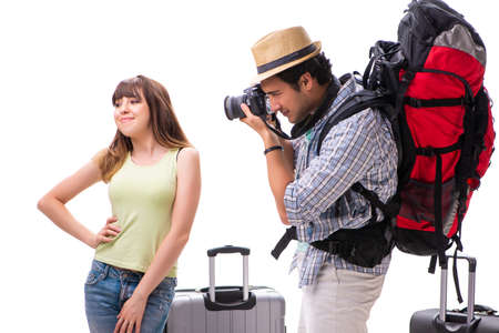 Young family preparing for vacation travel on white