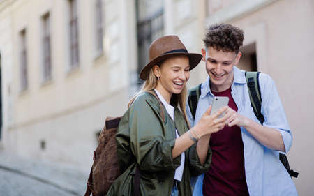 Young couple travelers with smartphone in city on holiday, sightseeing.