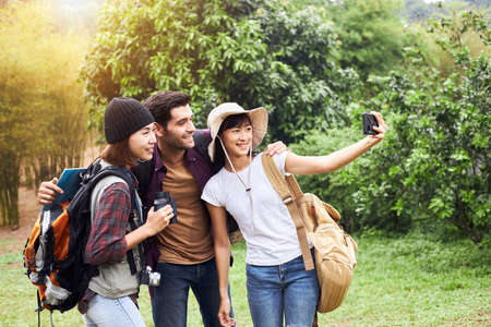 Three tourists taking a selfie with a mobile phone while traveling in the forest. A group of backpackers enjoys hiking during the summer vacation. Travel concept.