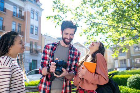 Portrait of young friends walking looking at the photos