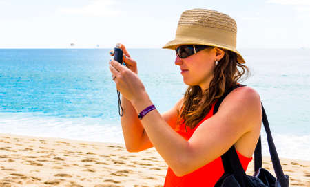 Take a mobile picture on your phone seashore. Female hands hold the phone and take pictures. Travel photography.