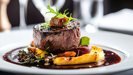 A beautifully presented juicy grilled beef steak garnished with fresh herbs, accompanied by a glass of red wine, perfect for an elegant dining experience.