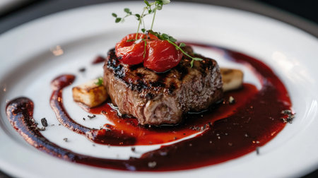 A beautifully plated gourmet grilled steak rests on a bed of colorful roasted vegetables, artfully drizzled with rich red sauce, showcasing culinary excellence.