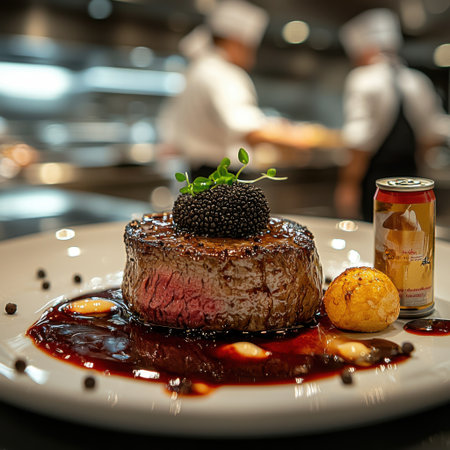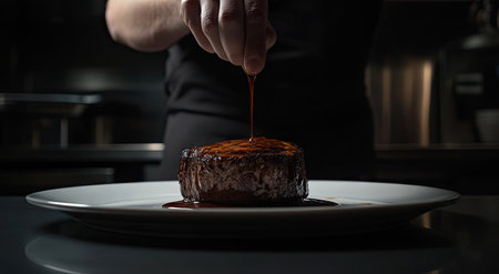A chef's hand delicately drizzles sauce onto the perfectly seared filet mignon on an elegant white plate, showcasing its rich color and textured skin against a dark background. The dish is placed in front of a professional kitchen setting with stainless steel appliances and minimalist decor, emphasizing elegance and culinary artistry. High-resolution photography, shot with a Sony Alpha A7 III camera using an f/8 aperture for sharpness, captures the scene. --ar 78:43 --v 6.1 Job ID: 52f0e695-ee9e-4dee-8ef8-c3c361db4f92