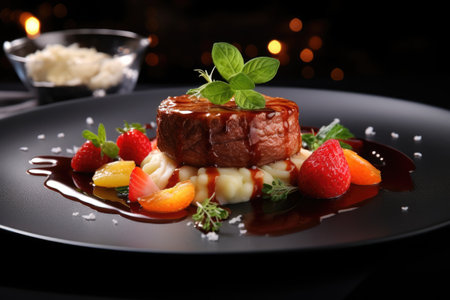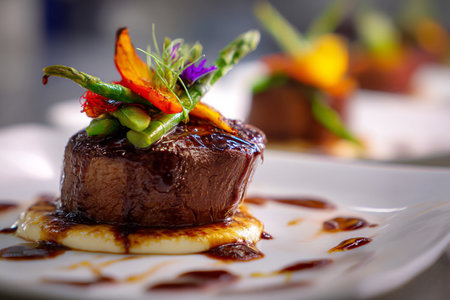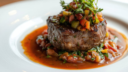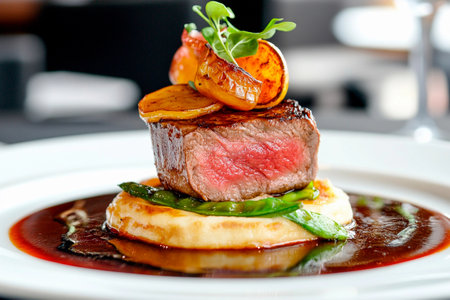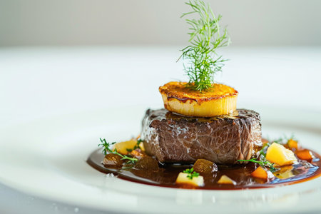 Gourmet steak topped with caramelized onion and fresh herbs on an elegant plate with artistic garnishes. Concepts of fine dining, culinary arts, and food presentation.