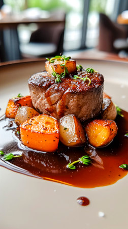 Exquisite Gourmet Steak Entree Served with Creamy Mashed Potatoes and Colorful Roasted Vegetables