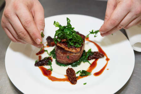Chef is decorating tenderloin steak with herbs
