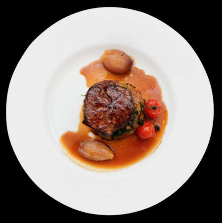 Luxury food. Plate with Fried or griled meat steak. Juicy veal Medallion with rosemary in tomato sauce. Top view. Vertical format. Soft focus. Close-up shot.