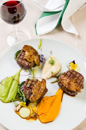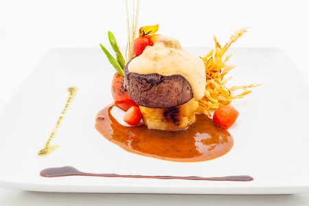 Fillet of Veal topped with Foie Gras. Garnished with vegetable