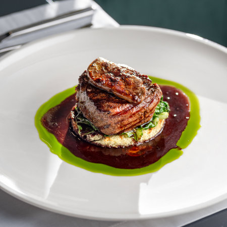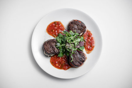 top view of meat beef medallion on tomato and grilled eggplant with salsa sauce