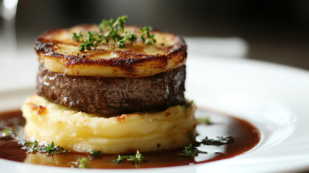 Indulge in a beautifully plated beef fillet, served atop creamy mashed potatoes, garnished with fresh thyme and a rich sauce, perfect for gourmet dining.