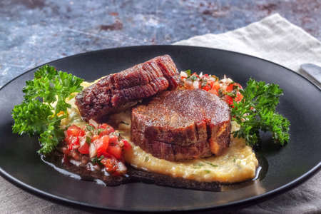On a dish beef medallions with tomato salsa and cream polenta