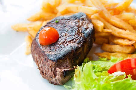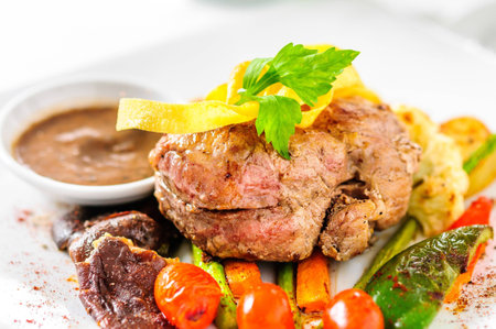 Beefsteak dishes Decoration on a white plate