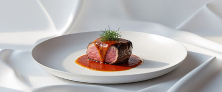 A gourmet steak plate featuring a filet mignon, drizzled with a rich sauce and garnished with fresh herbs on a white background.