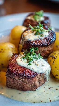 Savory beef tenderloin is topped with a rich, creamy sauce and garnished with fresh herbs, served next to perfectly cooked golden potatoes on a white plate.