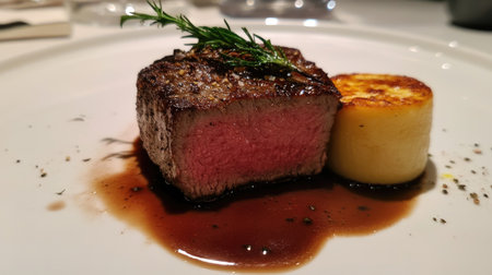 A luxurious steak dish with roasted potatoes and a rich sauce, on a finely set table with wine