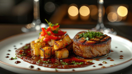 Close up to delicious gourmet dish with bokeh lights of elegant restaurant as background. Meat, potatoes, greens. AI Generative.