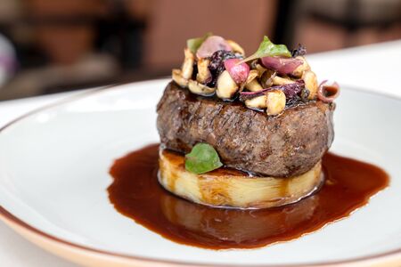 Tournedos Rossini. Foie gras, Black Angus beef tenderloin, with red wine sauce. Fillet mignon steak with Foie Gras. Serving in the restaurant.
