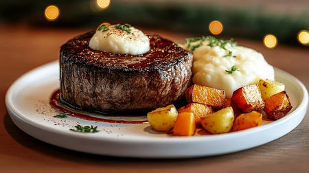 Mouthwatering Exquisite Steak Dinner Presentation with Creamy Mashed Potatoes and Grilled Vegetables