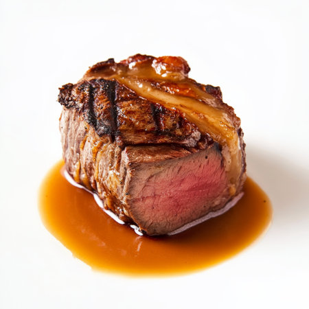 A beautifully scored piece of meat, its crusty showcasing the Maillard reaction, served with a rich and flavorful sauce, emphasizing the precision and technique of meat cooking in haute cuisine, isolated on clean white background.