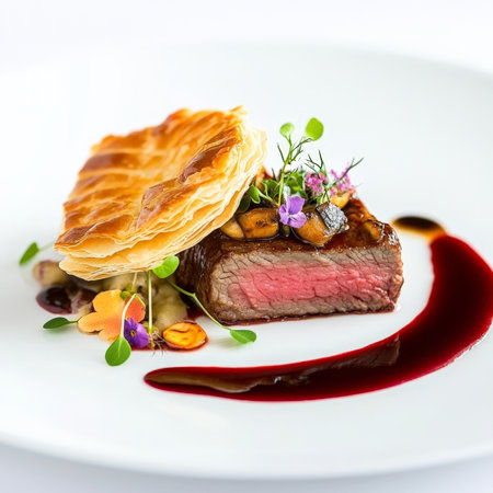 A deconstructed beef Wellington, featuring a perfectly seared filet mignon, a delicate mushroom duxelles, and a crispy puff pastry element, served with a rich red wine reduction, garnished with microgreens and edible flowers, presented on a minimalist white plate, showing the precision and artistry of high-end culinary presentation, isolated on a clean white background.
